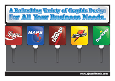 CJ & Friends: A postcard done to advertise a refreshing selection of design solutions to help any business.